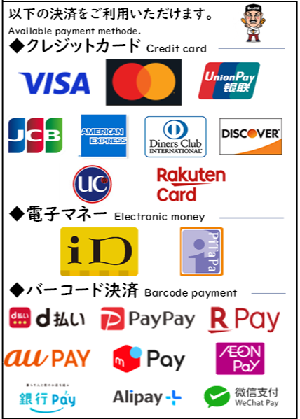 | 支払い方法 | 現金 クレジットカード 電子マネー QRコード決済 ご利用いただけます。 ![]() |