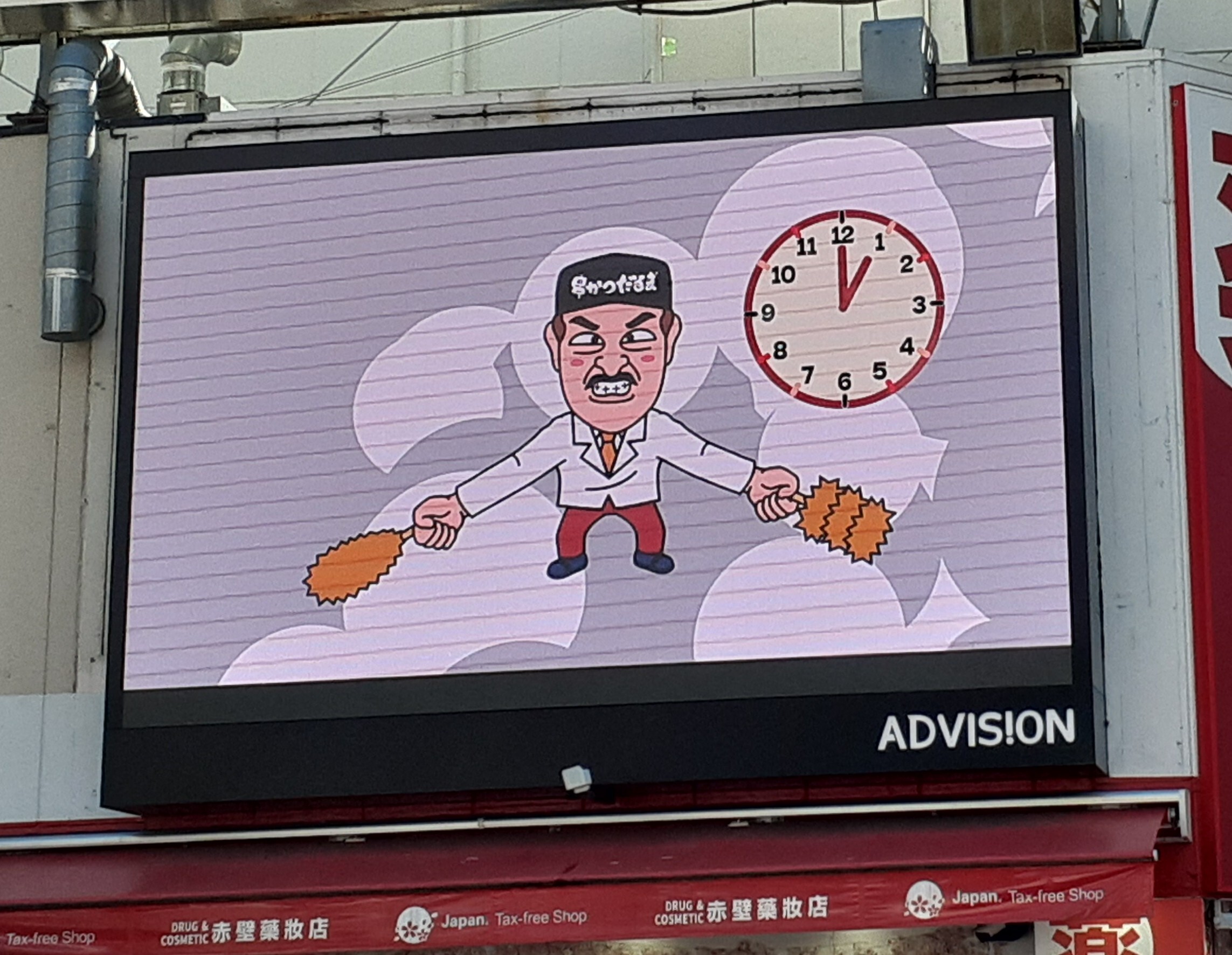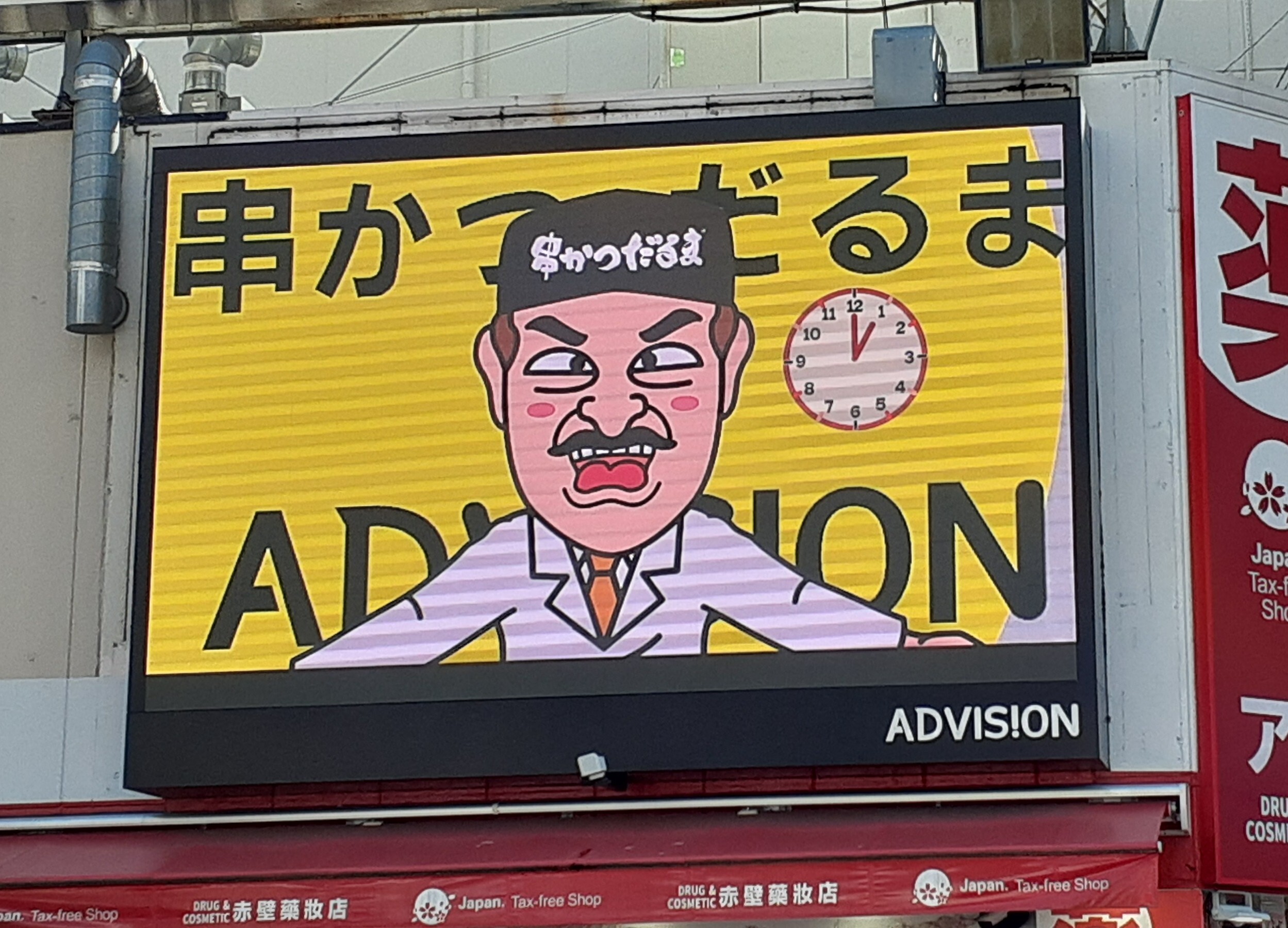 戎橋の動画にだるま会長の時報が登場 2025/10/06 大阪・ミナミと戎橋筋商店街と千日前通りとの交差点の南東角にある動画ビジョン(縦約3m、横約5m)に時報が流れるサービスが始まりました。 朝9時から24時まで毎時00分の時に串かつだるまのマスコット・だるま大臣のイラストが流れ、だるまの会長上山勝也の声で昼12時は「お昼やで!12時 串かつ食べてや」、22時は「10時 じゅーじゅー承知の串かつ」などそれぞれ違うナレーションです。 ぜひ見てください。