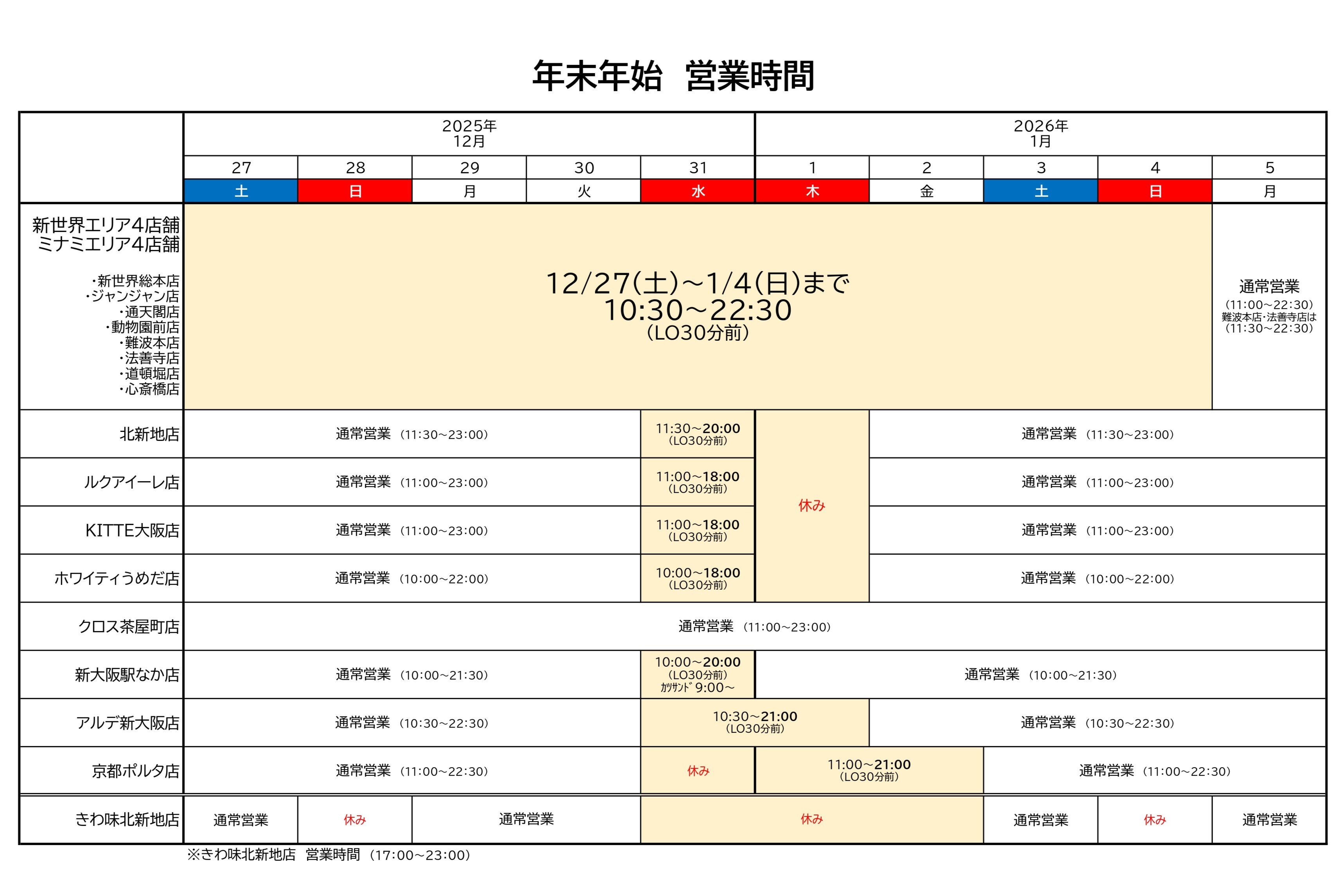 年末年始営業時間のお知らせ