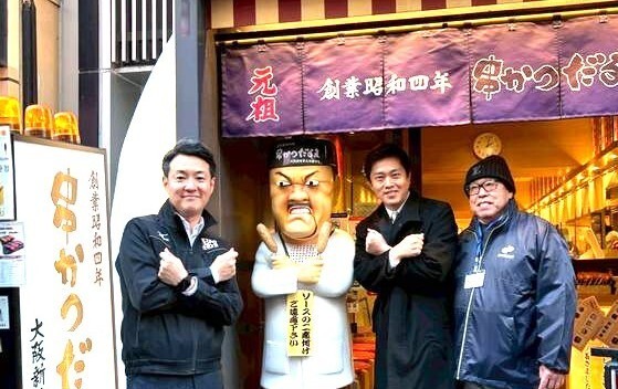 大阪府知事、大阪市長 道頓堀店ご訪問 2025/12/22 大阪府の吉村知事と大阪市の横山市長が12月22日、大阪・道頓堀商店街を視察され、途中、串かつだるま道頓堀店前で記念写真に応じてくださいました。吉村知事と横山市長は、道頓堀商店街のゴミ問題や違法駐輪、喫煙所、トイレ整備などの懸案の現地事情を見るため、来られました。吉村知事は2026年度予算に対策費を計上することを表明されました。